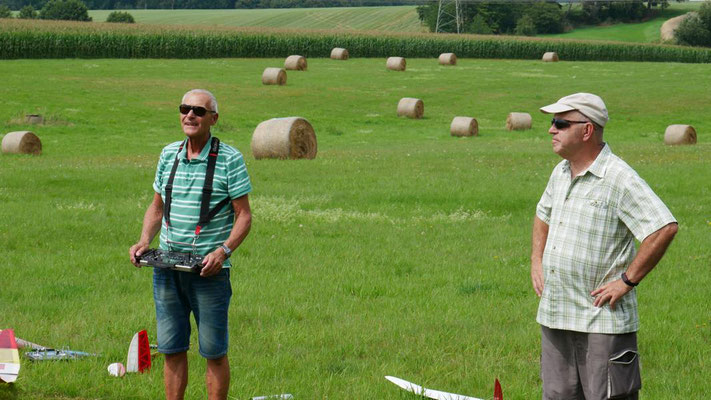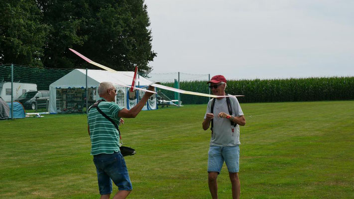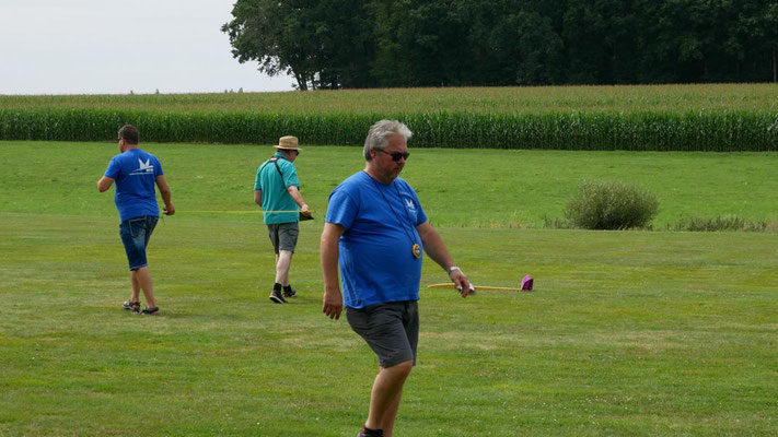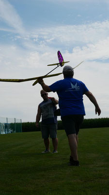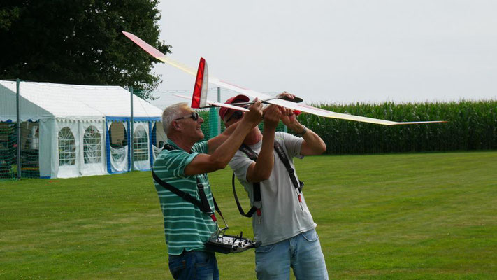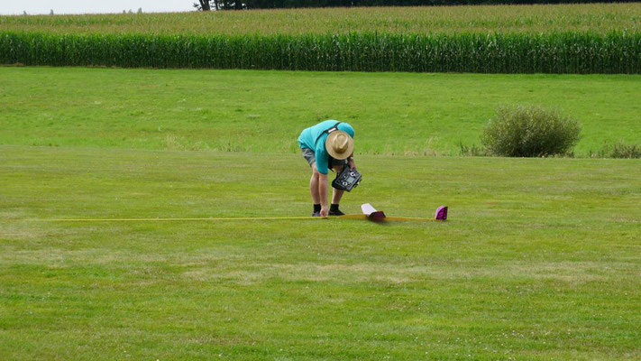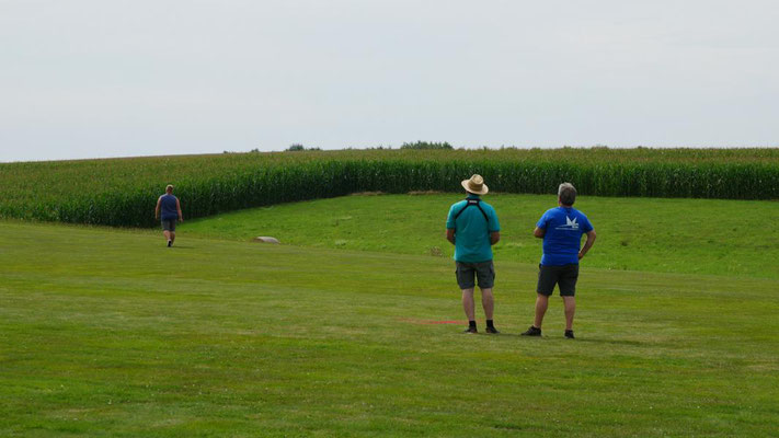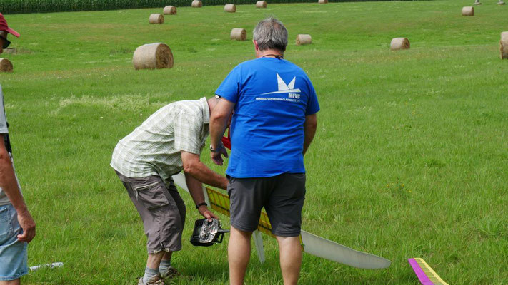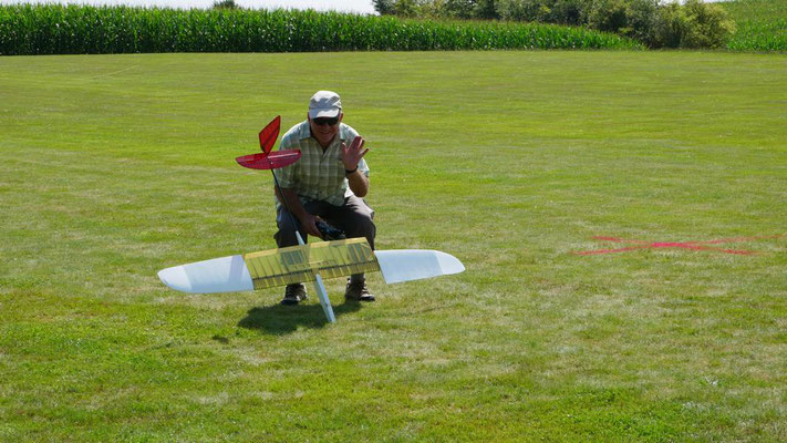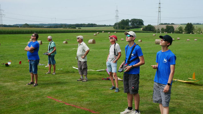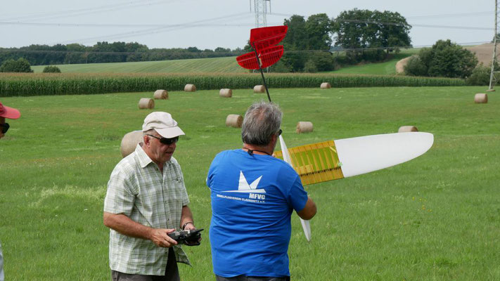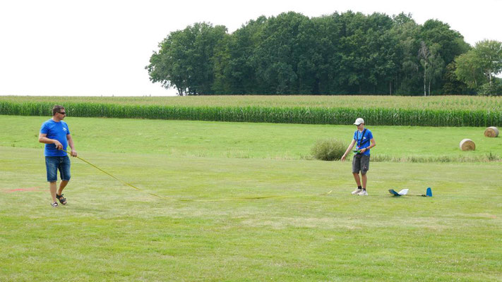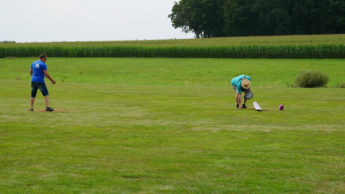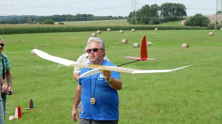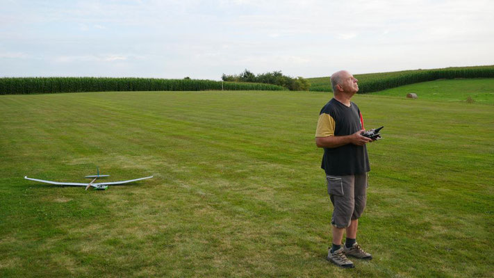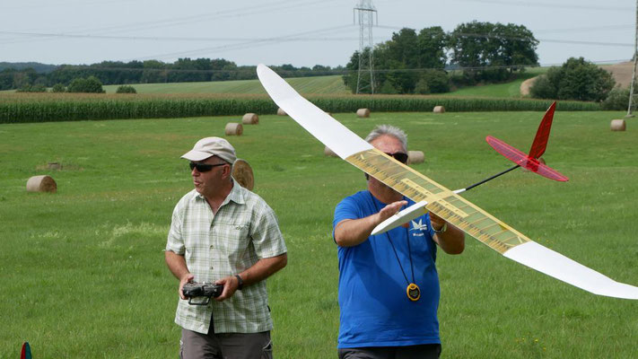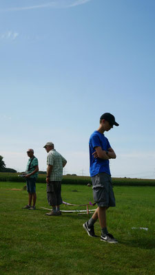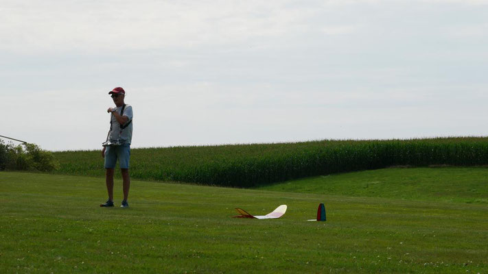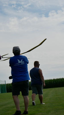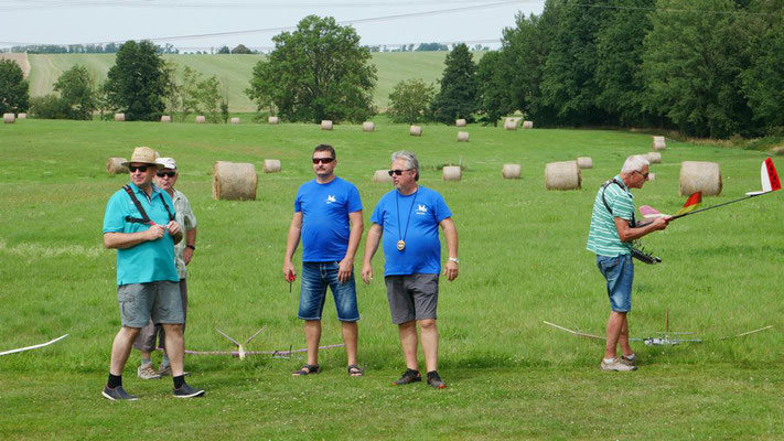 Nach einem sehr durchwachsenem Sommerabschnitt hatten sich bei nunmehr ruhigem Flugwetter die insgesamt 9 angemeldeten Teilnehmer auf dem Modellflugplatz eingefunden. Darunter waren ebenfalls 2 Gast-Piloten aus Großenhain, worüber wir uns natürlich sehr gefreut haben. Ab 10:00 Uhr starteten die ersten Probeflüge und Aufwärmrunden. Aufgrund der vorherrschenden Süd/Süd-West-Windrichtung und der damit verbundenen eingeschränkten Startbahnlänge wg. Maisanbau, konnte der Wettbewerb lediglich mit einem verkürzten Hochstartseil durchgeführt werden. Dementsprechend wurde die erforderliche Flugzeit auf 4 Minuten reduziert. Nach einer kleinen mittäglichen Stärkung, startete ab 13:00 Uhr der erste von insgesamt 4 Wertungsflügen. Der Wind hatte sich nunmehr auf Süd-West eingepegelt und die thermischen Aufwinde kamen so langsam in Schwung. Es brauchte natürlich das notwendige Quäntchen Glück, um einen günstigen Thermikbart erhaschen zu können und damit die 4 Minuten Flugzeit zu erzielen. Hatte man dies gemeistert, hieß es nur noch, so dicht wie möglich am Zielpunkt zu landen und dabei das Modell nicht zu beschädigen.