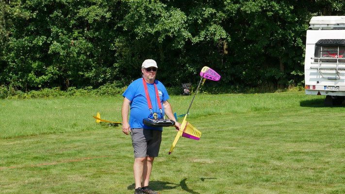 Am 9. August 2025 fand unser diesjähriger Vereinspokal-Wettkampf in der F3 RES-Klasse statt. F3 RES bezieht sich auf eine Klasse im Modellflug, die auch als F3L bekannt ist. Es handelt sich um eine Modellflugklasse, bei der die Modelle hauptsächlich über Seitenruder (Rudder), Höhenruder (Elevator) und Bremsklappen (Spoiler) gesteuert werden. Diese Modelle sind oft in Holzbauweise konstruiert, wobei GFK/CFK-Teile eingeschränkt erlaubt sind. Die Modelle werden in der Regel über ein 100 m langes Hochstartseil, welches über einen Spanngummi vorgespannt wird, mittels Handstart auf Höhe befördert. Nach dem automatischen Ausklinken des Zugseils ist eine Flugzeit von 6 Minuten zu erreichen und innerhalb dieser Zeit auf einem festgelegten Landepunkt zu landen.